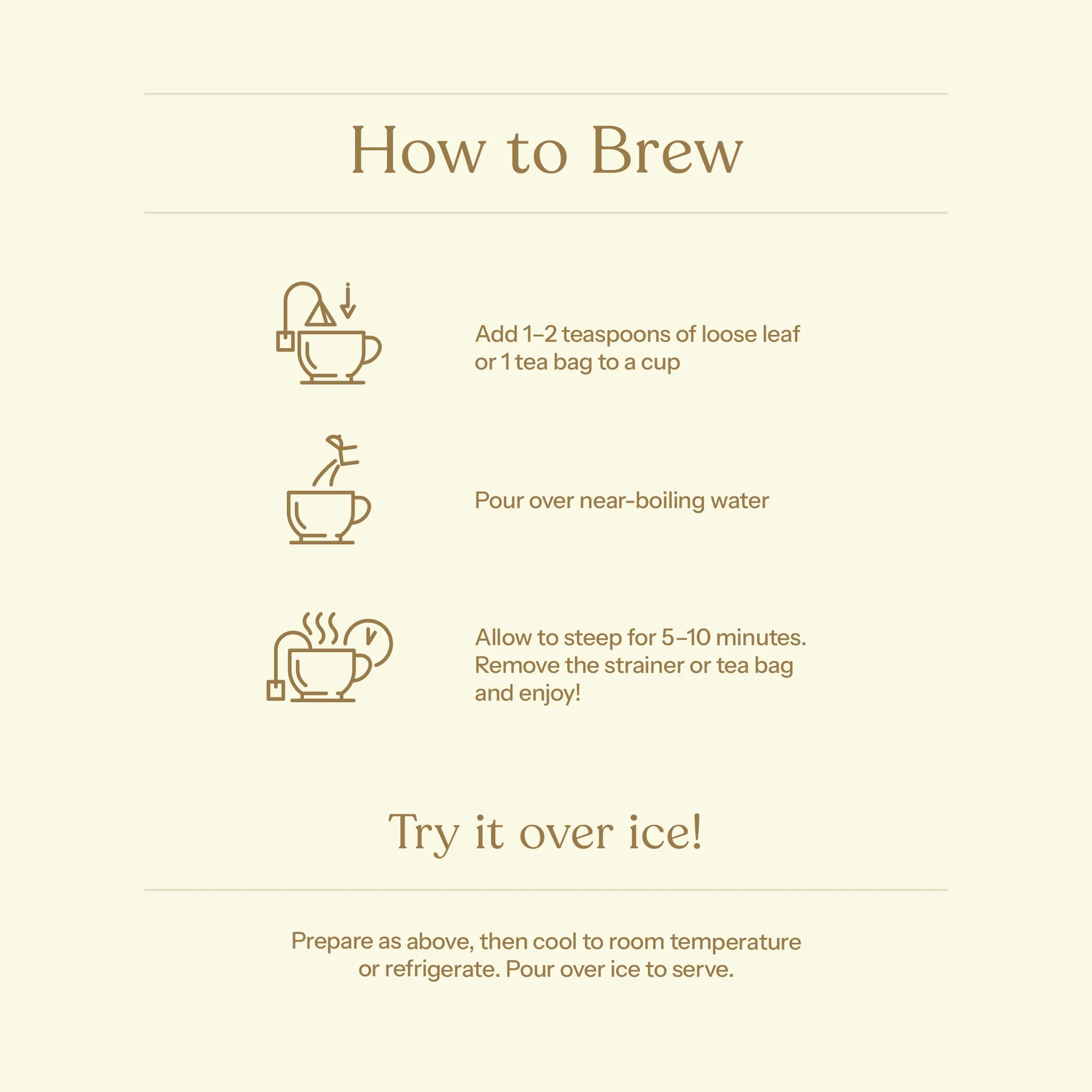 Add 1–2 teaspoons of loose leaf or 1 tea bag to a cup. Pour near-boiling water over, steep for 5–10 minutes, then remove the strainer or tea bag.